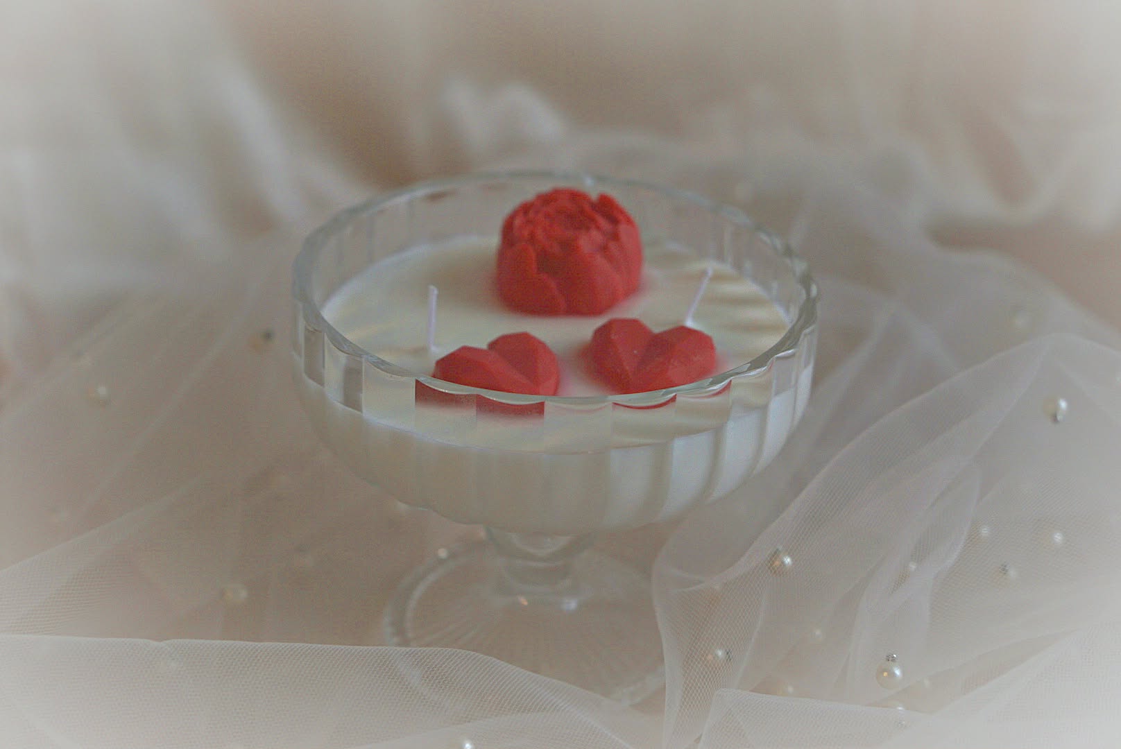 Käsitööna valminud disain: Küünla pinnal on detailirohke punane lilleõis (roos/pojeng) ja kaks modernse geomeetrilise lõikega südant.
